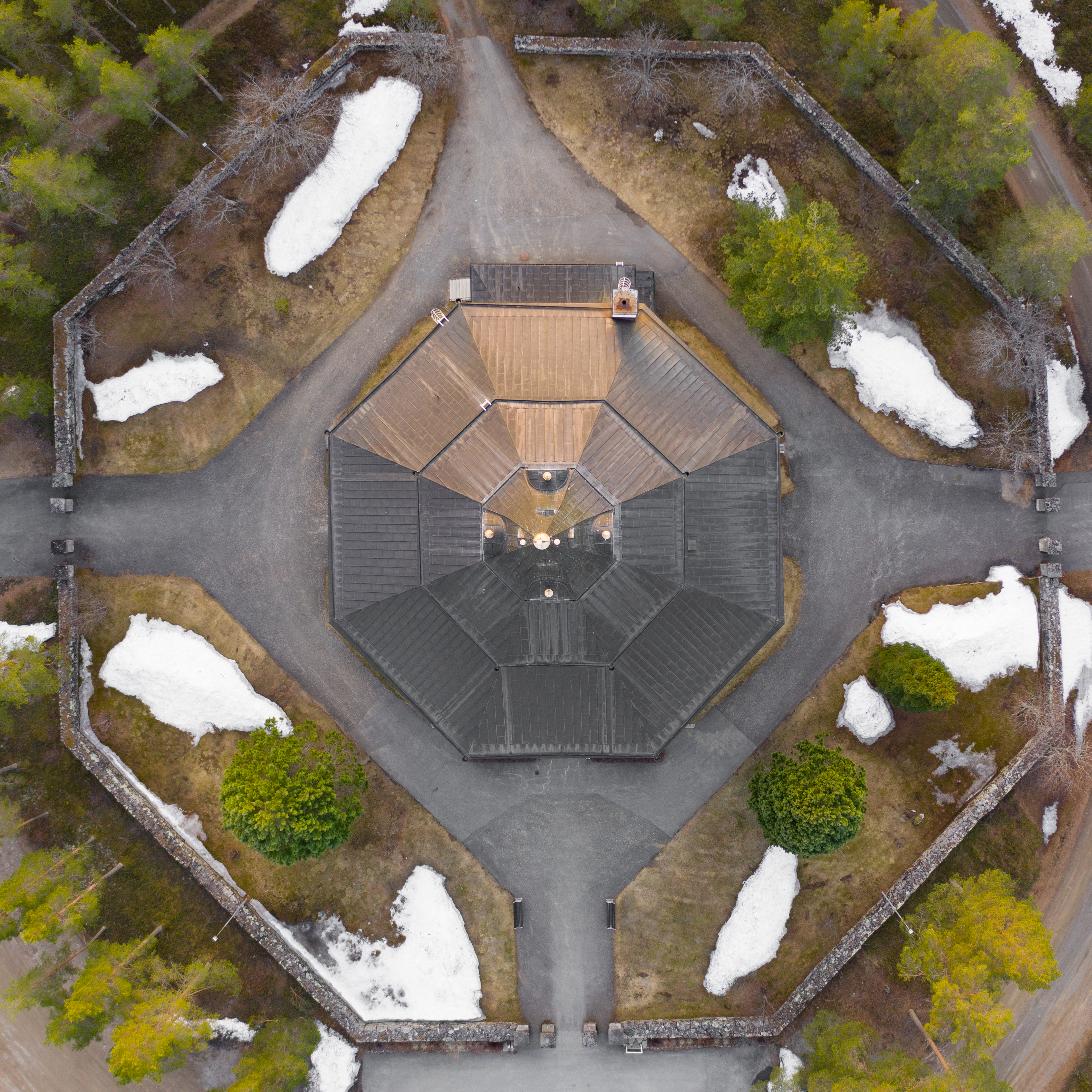 Det är ju inte första kyrkan som dyker upp i vår serie Drönarsöndag, och förmodligen inte den sista heller. Här en kyrka i en spännande åttkantig form. Lägg även märke till omkringliggande stenmur som går i samma form.