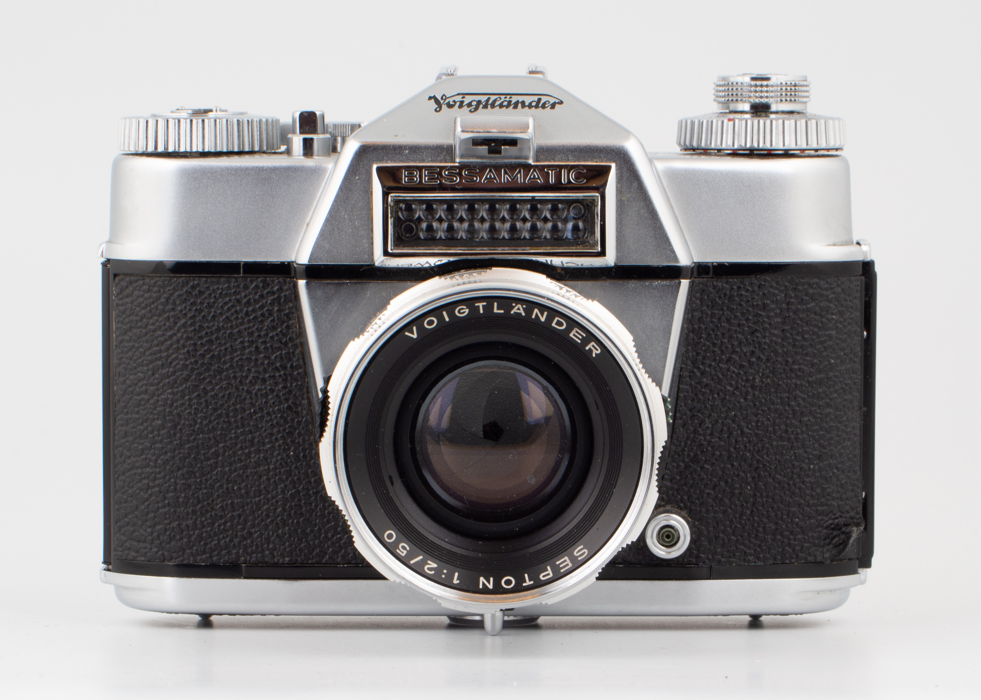 Voigtländer Bessamatic är en rejäl pjäs att släpa på, då bara huset väger hela 802 gram. Denna kamera har centralslutare och hara inte automatiskt återgående spegel. När du tagit bilden så blev det svart i sökaren. När du sedan drar fram filmen så dras spegeln ner igen och centralslutaren öppnas.