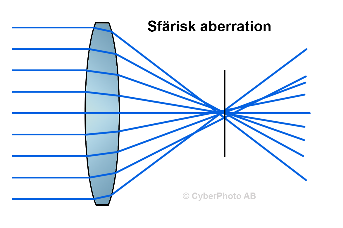 Sfärisk aberration är när olika delar av ett linselement inte återger ger inkommande ljus på samma punkt. Om vi tänker oss ljusstrålar, så kommer en ljusstråle som går genom linselementets mitt inte att träffa samma punkt som en ljusstråle som går genom linselementets kant. På grund av detta så kommer den sfäriska aberrationen att leda till sämre skärpa och sämre kontrast. Ju mer du bländar ner desto mindre problem får du med sfärisk aberration då mindre av linselementets yta nyttjas. Dock till en viss gräns, för vid mindre bländaröppningar så kan diffraktion uppstå. De flesta objektv är som bäst kring f/8. Med modernt asfäriskt glas så kan objektiv vara skarpa ända ut till hörnen redan vid full öppning. På illustrationen här ovanför kan du tydligt se problemet.
