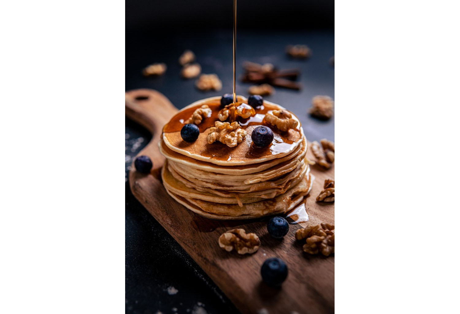 Här presenterar vi tredjeplatsen i vår tävling. Detta bidrag är inskickat av Carl Bergsdorf. Vi tycker att fotografen verkligen har lyckats få med allt man önskar i en matbild. Belysningen är mjuk och behaglig samt skärpan utgår i en fin bokeh. Vi gillar att färgerna håller ihop med bruna plättar, nötter, sirap, skärbräda och de kontrasterande blåbären och bakgrunden i samma nyans. Han har även lyckats få med det viktigaste av allt, att det ser otroligt gott ut!