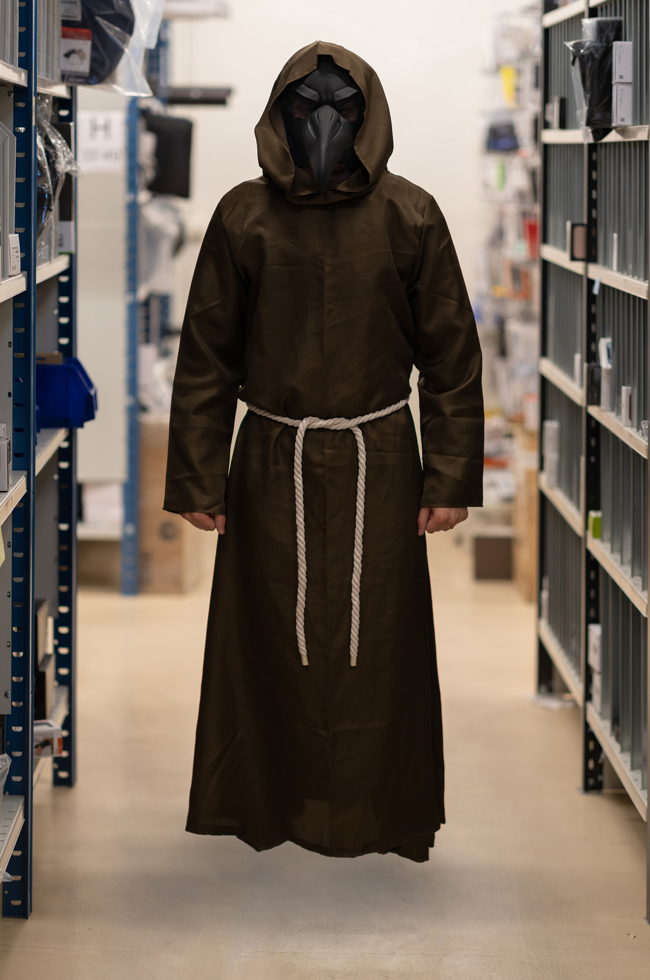 I denna pestens tid tänkte jag att vi skulle kunna ta en bild på en egen pestdoktor. Det kanske skulle kunna bli en intressant bild. Jag kunde inte låta bli att redigera bort fötterna så det ser ut som han svävar. Ingen på lagret har haft corona så det kanske fungerar.