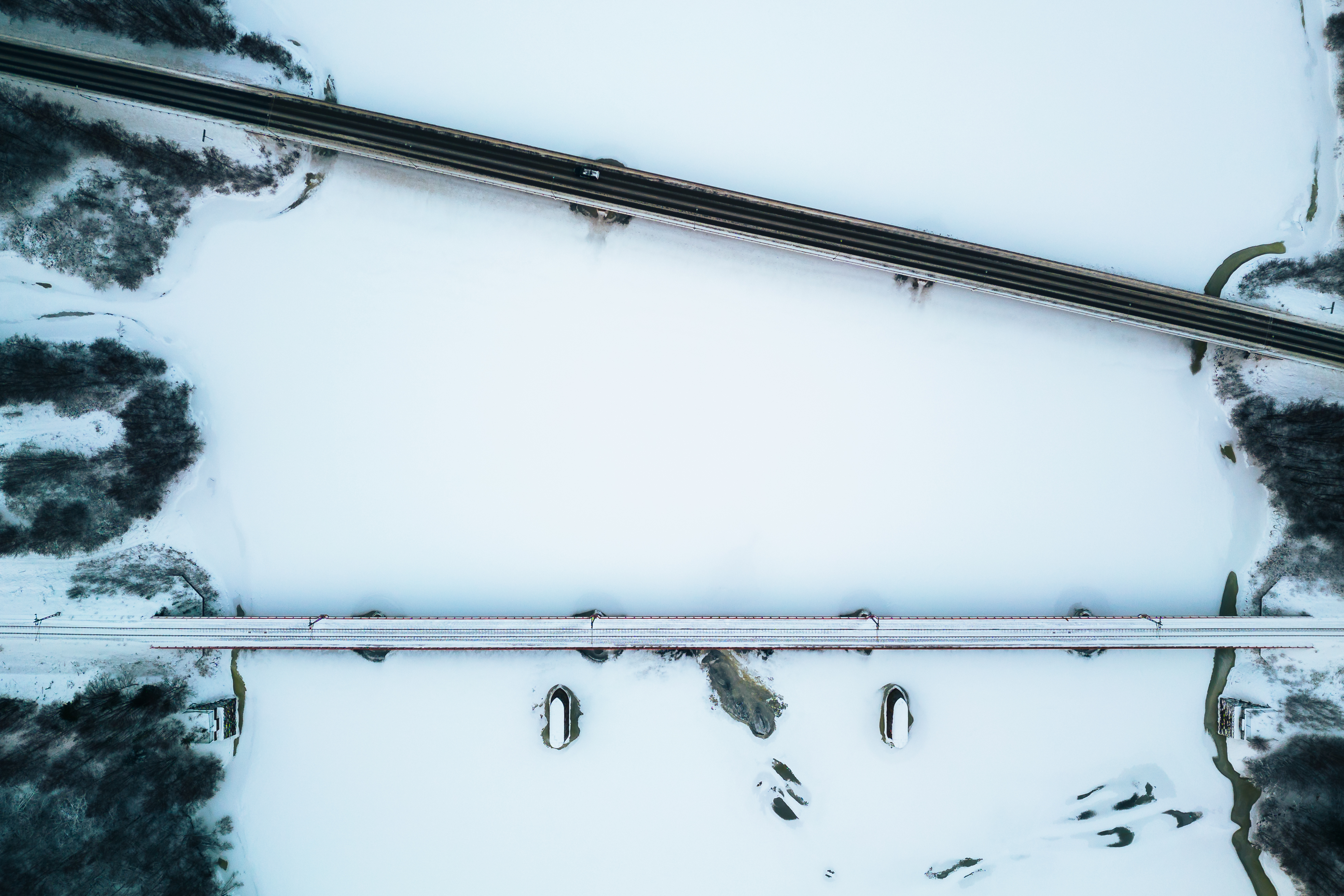 Den här bilden är tagen en bit utanför Vännäs när jag var ute och testade DJI Mini 3 Pro i någorlunda snöfall (det gick bra). När jag såg tågspåret tänkte jag att det skulle vara fräckt om jag kunde få en bild med ett passerande tåg på bron men tiden gick och inget tåg kom så när mitt tålamod, drönarens batteri och temperaturen i mina händer alla närmade sig 0 gav jag upp och beslöt mig att försöka igen en annan dag, men då ta tågtabellen till hjälp. Jag tycker dock att bilden med de två broarna blev rätt fin ändå.