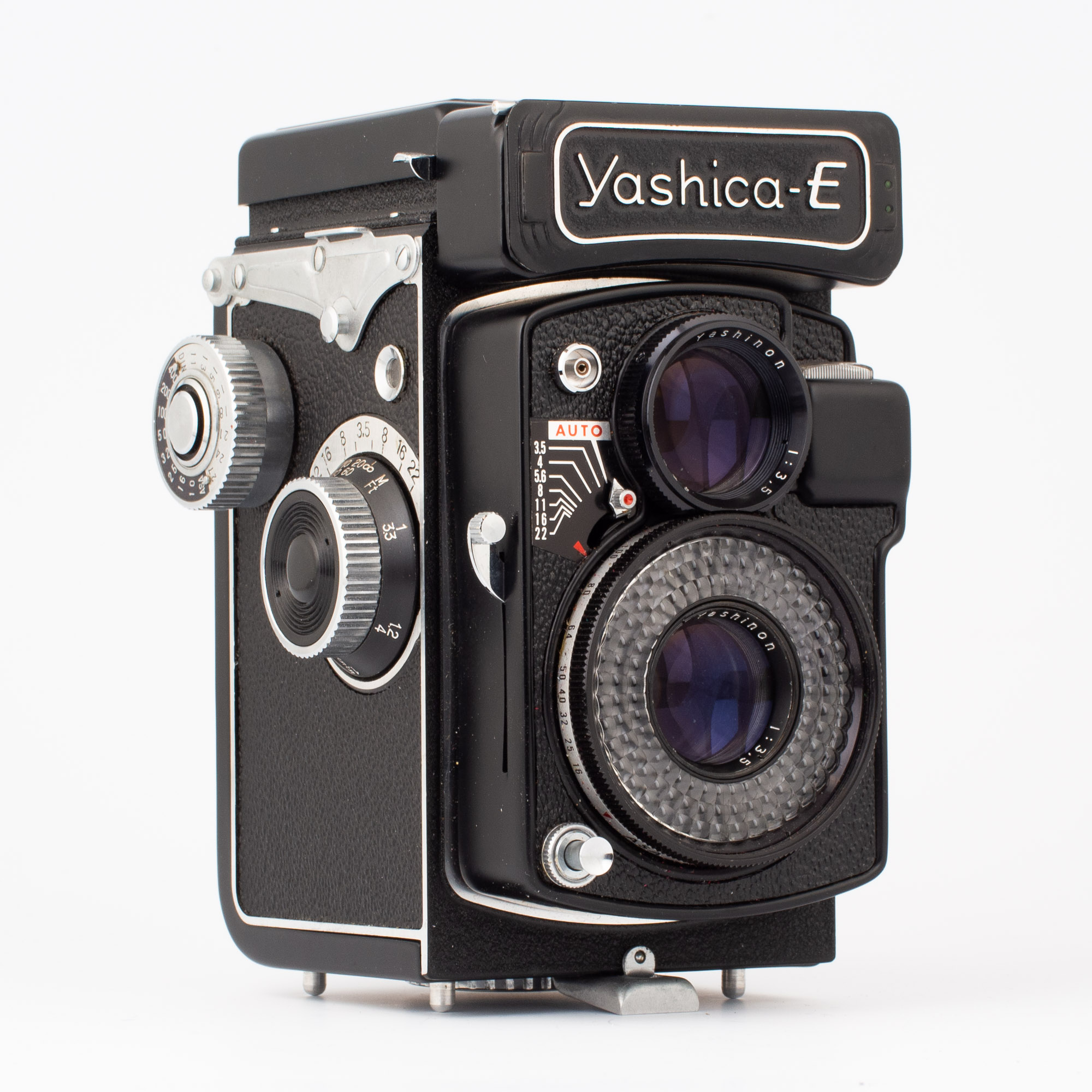 Yashica-E är som sagt en tvåögd spegelreflex och använder 120-film. Det som gör den unik är dess exponeringsautomatik. Den är nästan lika lätt använda som en Instamatic-kamera. Slutaren har en enda slutartid på 1/60s. Bländaren styrs av en selen-fotocell som sitter runt objektivet. Du kan även ställa in bländarvärdet manuellt om du så önskar.