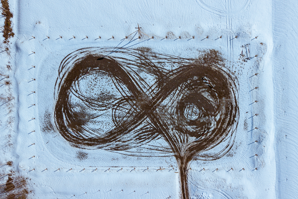 Dagen innan bilden togs hade något av ett fyrhjulingsrace ägt rum på denna ridbana vilket hade lämnat en rätt tydlig figur av siffran åtta (eller varför inte tecknet för oändlighet). Kollar man noga kan man se hopphinder mot hörnen som hade fått agera markörer för vart banan gick.