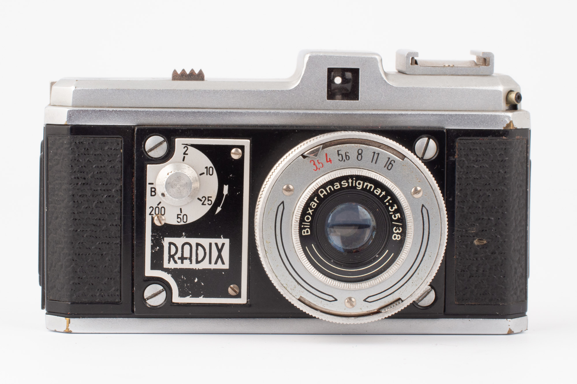 Radix finns i 13 versioner och vårt exemplar är troligen en Radix 35BH, även kallad Radix 5a, med tanke på den optik och den slutare som sitter monterad. Objektivet är ett Biloxar Anastgmat 38mm f/3,5. Slutaren klarar 1/200s - 1/2s + B.