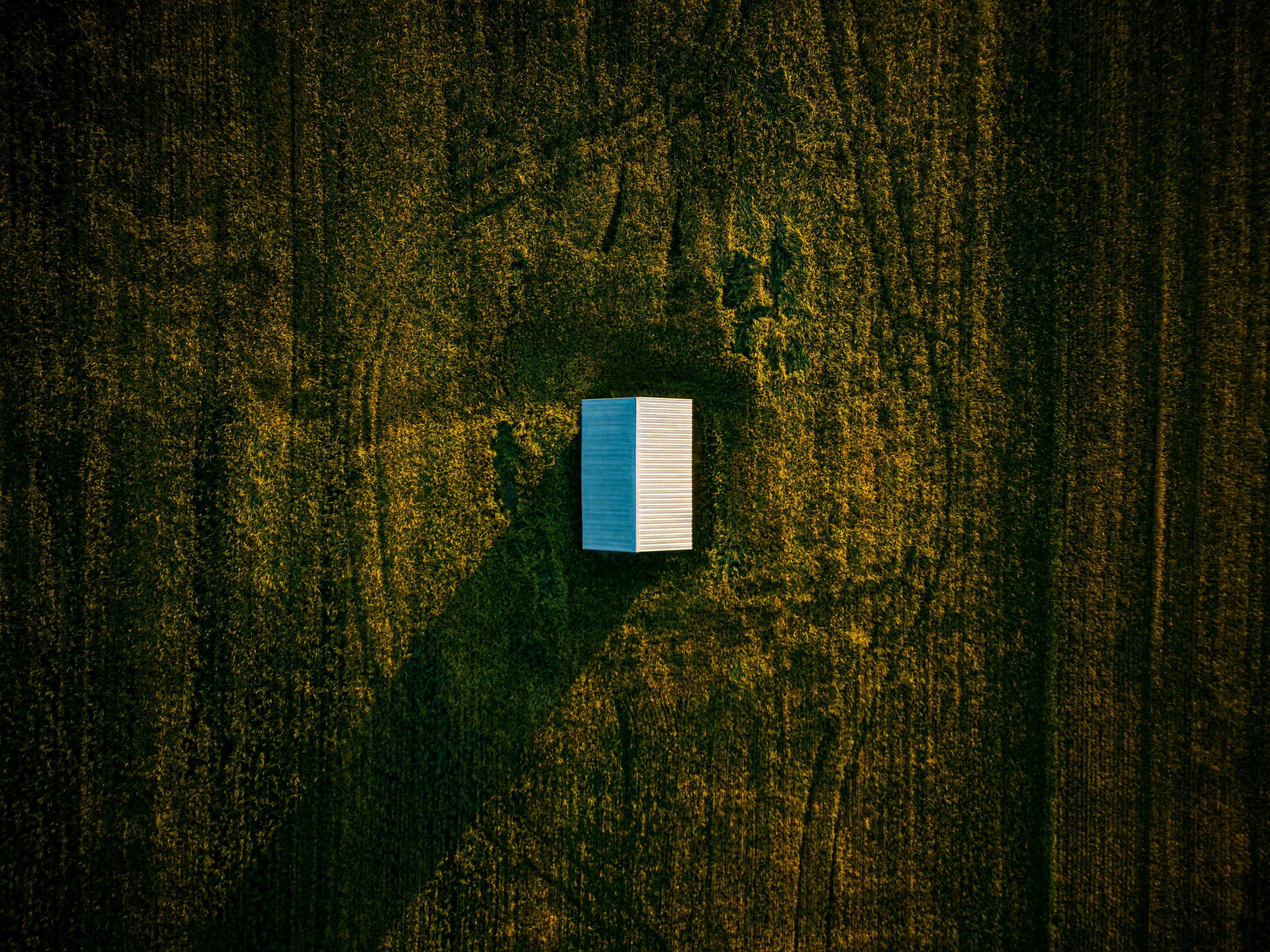 Mitt på en åker står det ett ensamt skjul. Med lite fantasi ser det ovanifrån ut lite som en uppslagen bok med spår, från vad man kan förmoda är en traktor, i marken omrking sig.