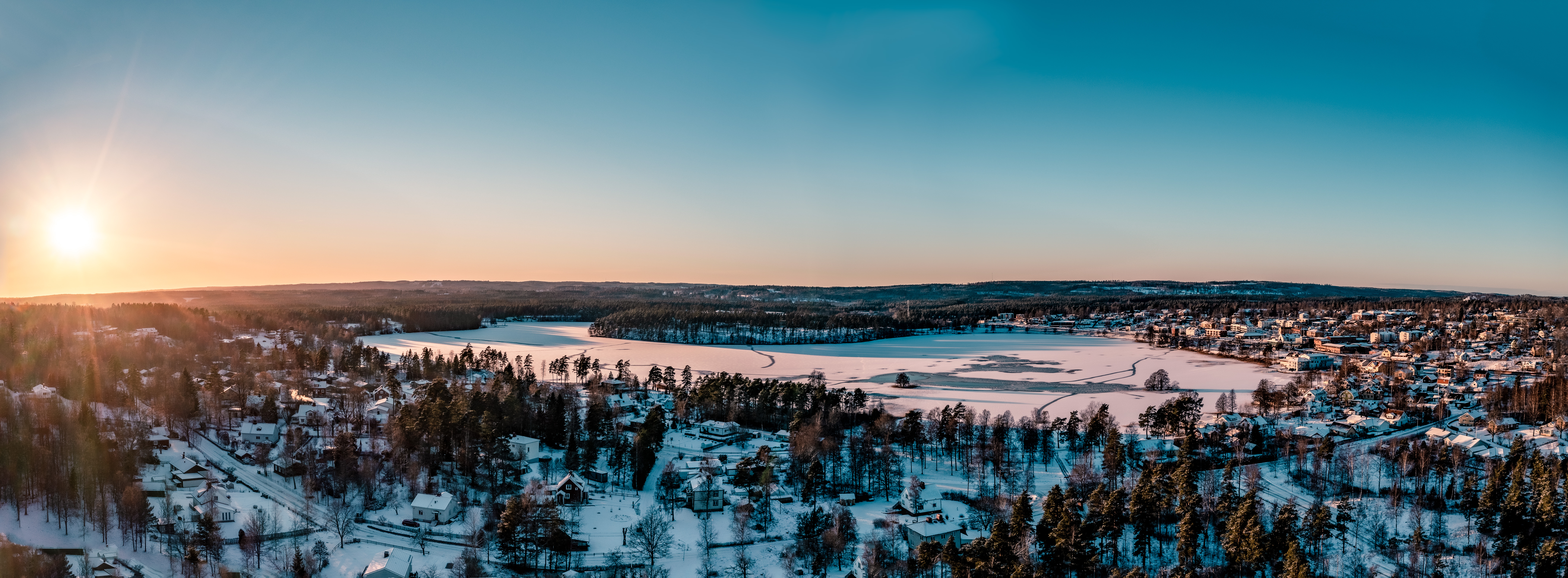 Robin: En créme färgad vinterkväll i januari 2022, eller snarare eftermiddag, skickade jag upp drönaren från pulkabacken och fångade en panorama av Mullsjö och Mullsjön. Jag är inget fan av vinter, men det finns färger som bara kommer fram på vintern.