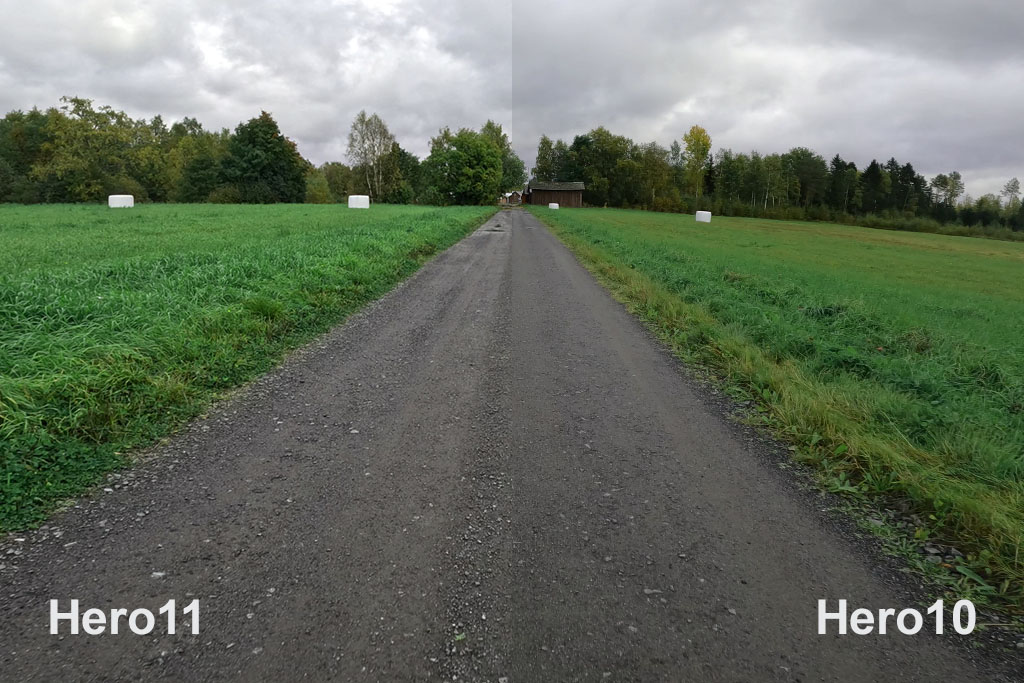 De två bilderna nedan är från exakt samma tidpunkt filmat med Hero11 och Hero10. Här syns en ganska tydlig skillnad på bättre teckning i himlen samtidigt som kontrasten är högre i Hero11. Hero10 ger överlag en aningen mörkare bild med lägre kontrast.