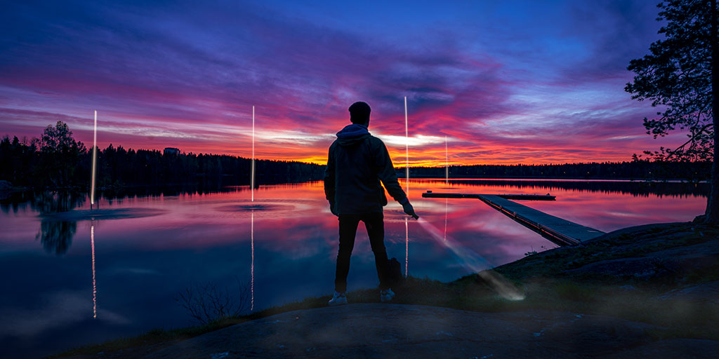 Den här bilden tog jag för en tävling för några år sedan där temat var ”ljus i mörkret”. Idéen till bilden var att göra pelare av ljus genom flera långa exponeringar av en drönare med en fasttejpad LED-belysning, något som jag absolut inte rekommenderar då drönaren gärna ville sjunka på grund av den extra vikten vilket var extra jobbigt ovanför vatten, sen slog jag ihop alla bilder i Photoshop.