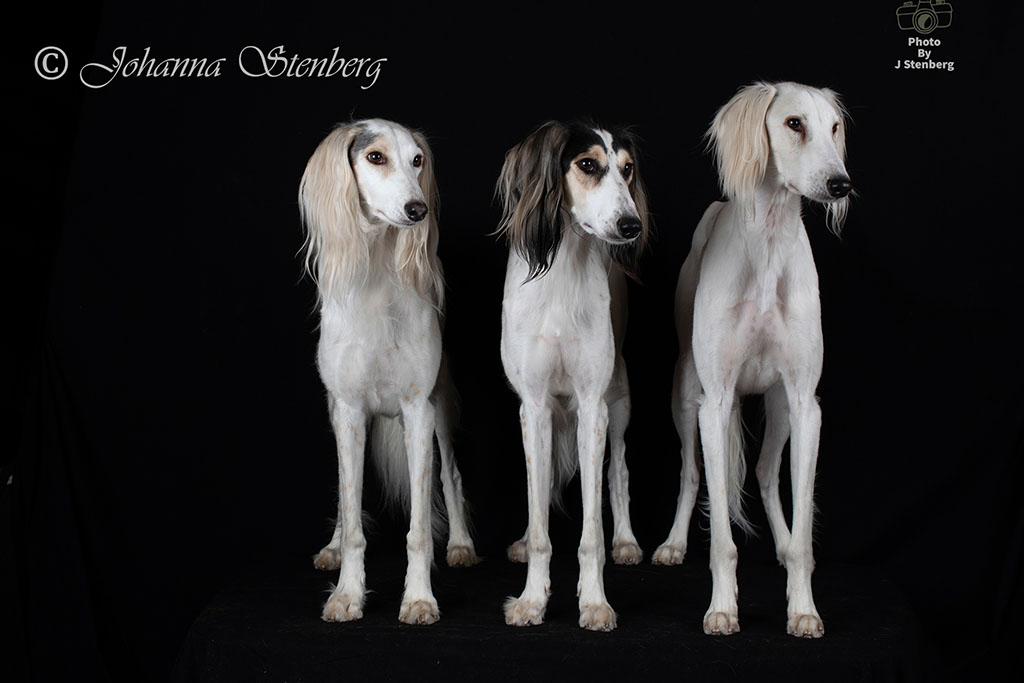 Johanna: De 3 Saluki hanarna som så samarbetar så fint under mattes påhitt till studiofotografering. Jazz, Faiad & Hubert.