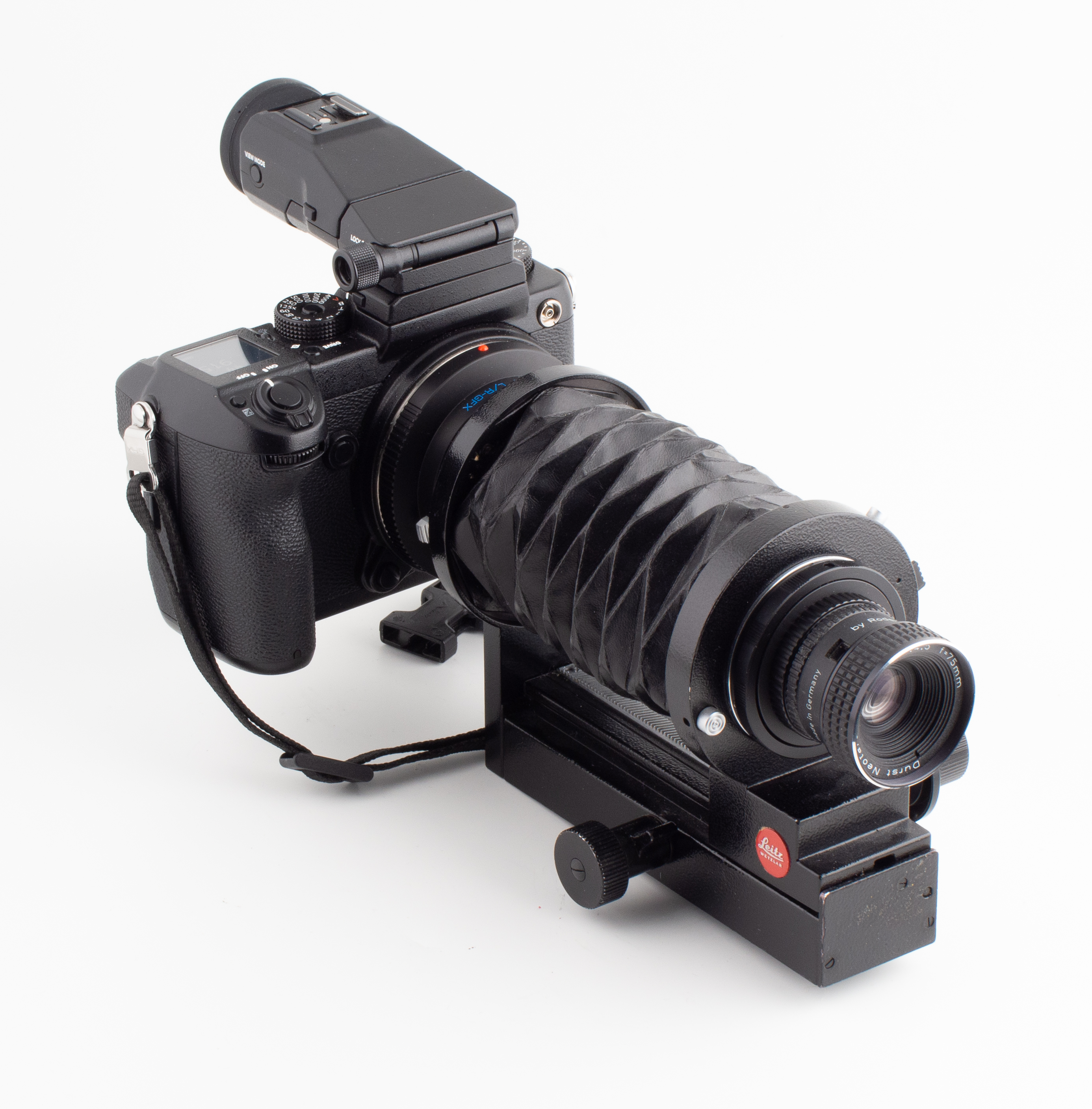 Här har jag satt objektivet på en Fujifilm GFX. Alla testbilder är tagna på mellanformat. Vill du se hur bilderna blir i småbildsformat, eller fullformat som det ofta kallas idag, så beskär du ner bilderna till 6768x4512 pixel. Inte ändra storlek på bilden utan ändra storlek på arbetsytan. Enda redigeringen från RAW till jpg var vinjetteringen. Jag har en Leica bälg tillgänglig som jag gärna använder då den håller en mycket högre kvalitet än det mesta som säljs nytt idag. För att få detta att fungera så har jag en Kipon adapter för GFX till Leica R, och då får jag kameran på bälgen. På andra sidan så har jag lyckats få tag i en T2 adapter för Leica R, sedan har jag en adapterring från T2-gänga till M42, och sedan en adapter från M42 till M39 gänga, sedan kan jag ansluta förstoringsobjektivet som då har M39 gänga.