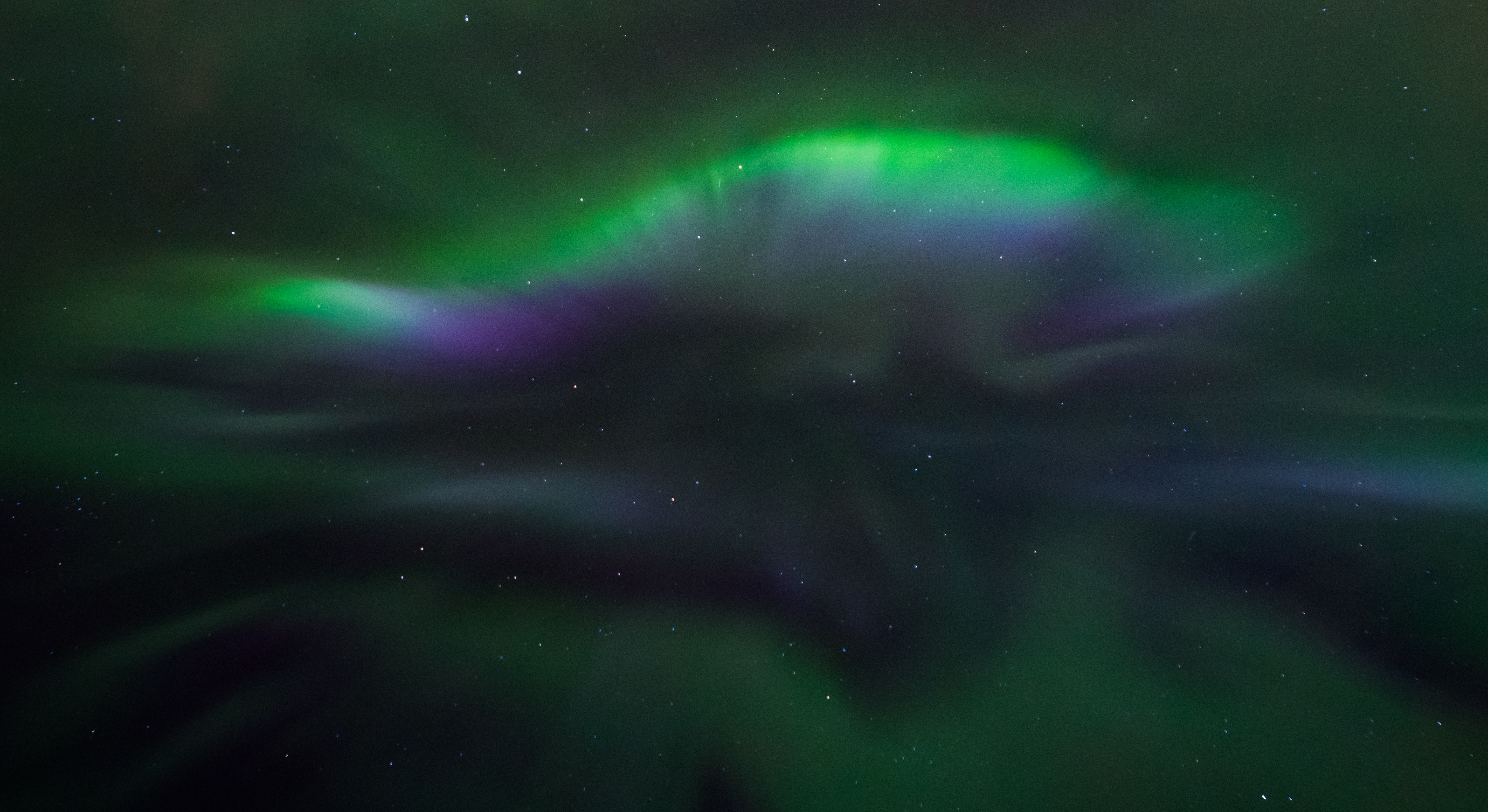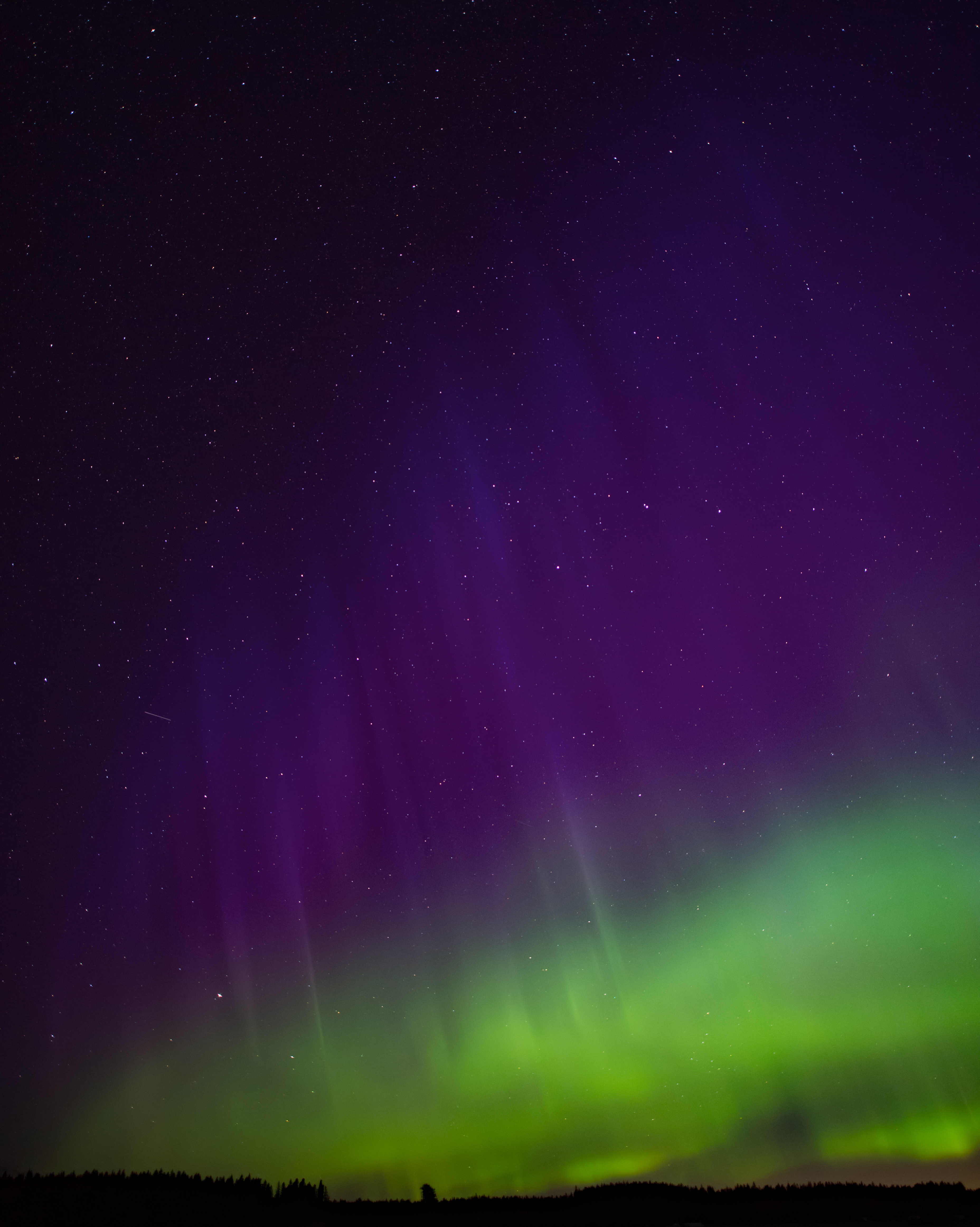 Den blå färgen i norrskenet alstras av kvävemolekylen N2 på cirka 110 km höjd. Detta är den enda bild jag tagit som kan ha blått i sig. Varför jag säger kan ha, är att det kan vara vitbalansen som luras lite, men här ser jag ändå klart grönt, lila och blått. De blåa ljuset i ett norrsken bildas på låg höjd så det kräver mycket energi för partiklarna att ta sig ner så lågt i atmosfären. Dessutom är det blå ljuset så svagt. Det är få som fått uppleva äkta blått ljus i norrskenet. Denna bild är ärlig. Jag har sett flera bilder som påstår sig vara blått sken i men typ 99% av dem är fusk i Photoshop.