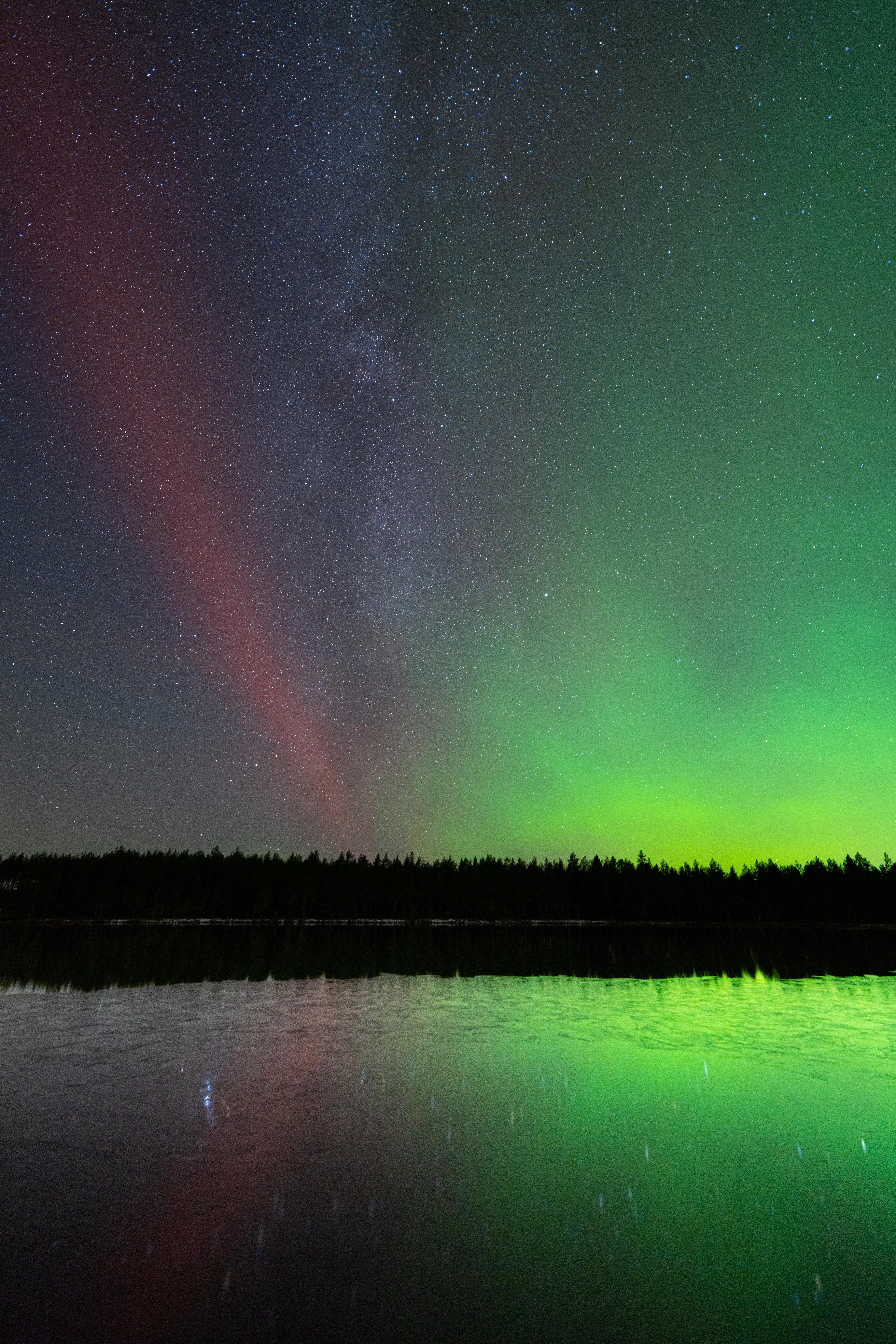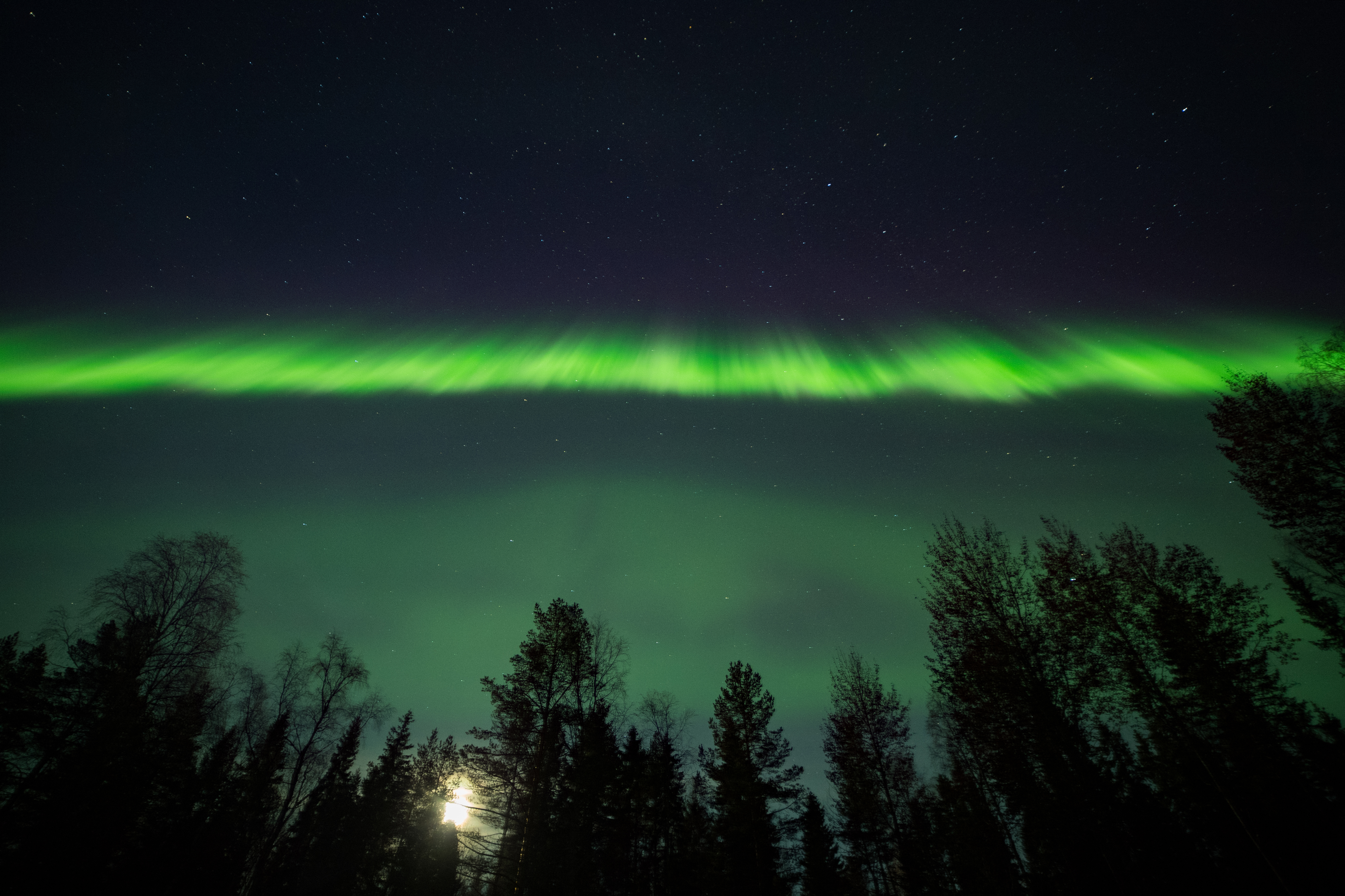 Jag och en vän åkte ut till en närbelägen sjö med förhoppning att få se norrsken. Detta trots att det var molnigt och att dimma skulle komma in. Väl på plats så såg vi ingenting, verkligen ingenting, då dimman omslutit oss. Vi gjorde upp en eld och grillade korv så länge. Norrskensappen glödde och alla siffror slog i taket. Någonstans däruppe dansade ett gigantiskt norrsken. Vi tyckte att det blivit ljusare så vi tog några bilder och upptäckte att det var norrskenet som lyste upp allting. Hela dimman var alldeles grön, kanske inte så konstigt då norrskenet var enda ljuskällan. Den här bilden tog jag här i Umeå. Helt galet när ett gigantiskt norrsken lyser upp en supertät dimma. Blir helt bisarrt... och coolt...
