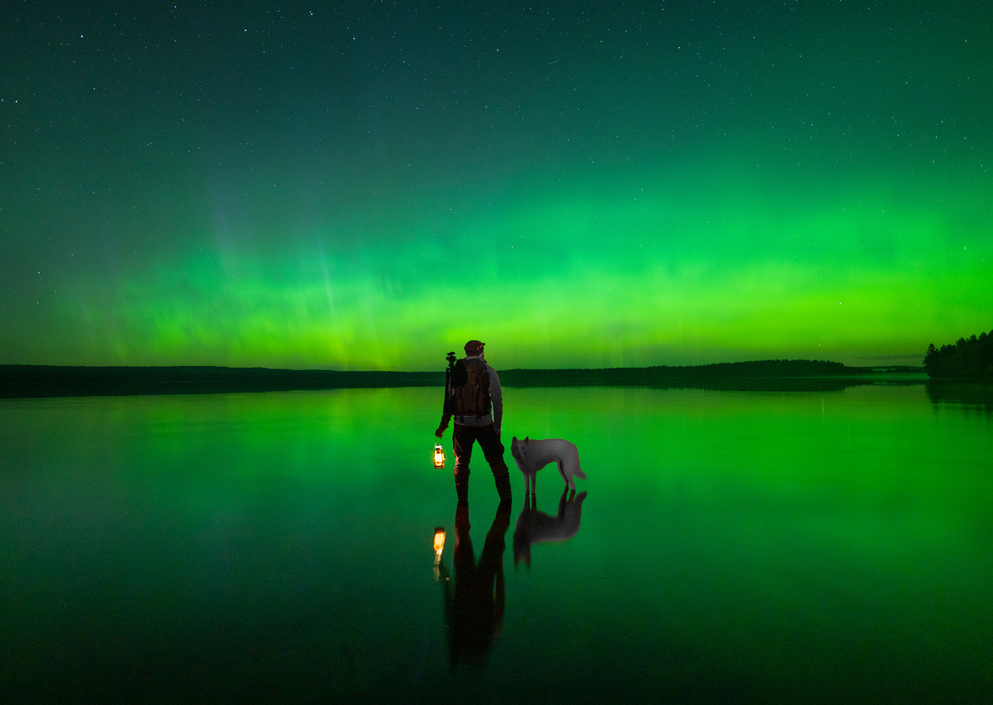 En vän och hans hund. Denna bild illustrerar verkligen vad norrskensfotografering handlar om. Att få uppleva otroligt vackra himlafenomen med trevliga vänner.