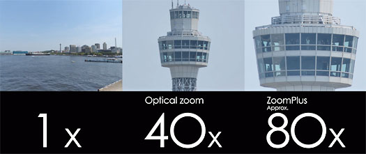 40x optisk zoom motsvarande 24-960mm (med upp till motsvarande 80x zoom via "ZoomPlus"-funktion)