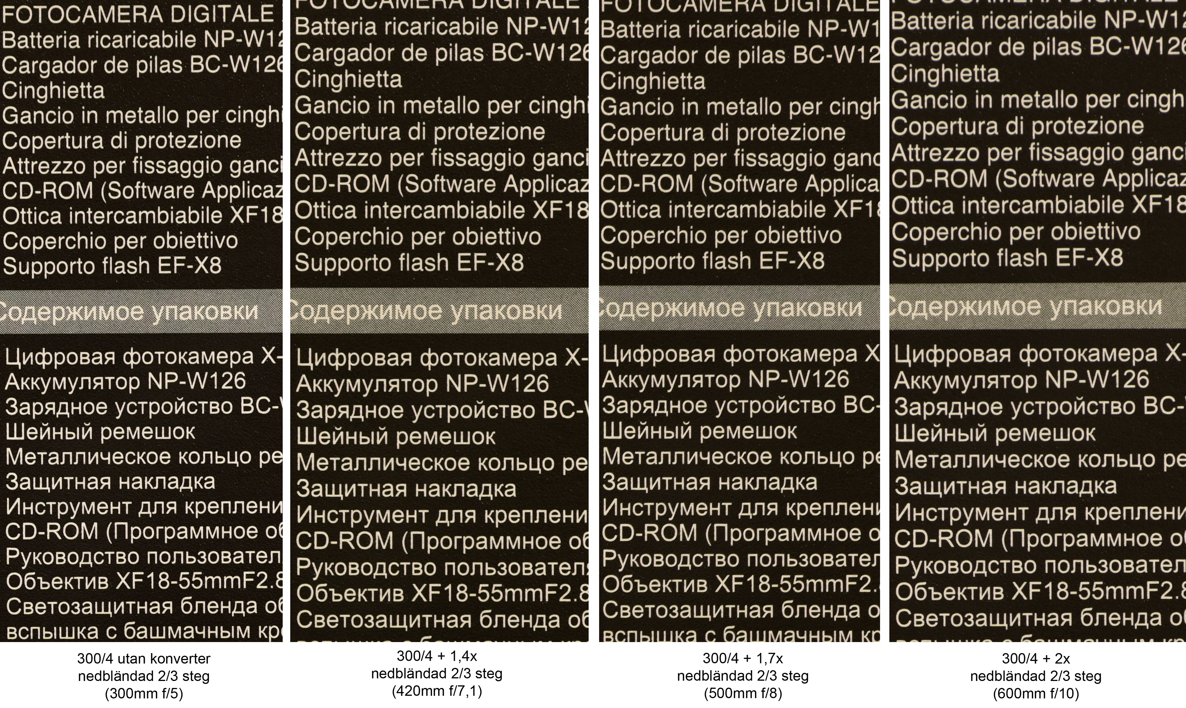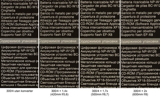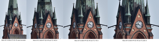 Bilden nedan visar skillnaderna i skärpa mellan Nikons tre konvertrar TC-14E III, TC-17E II och TC-20E III, samt första bilden utan konverter (Nikkor AF-S 300mm f/4 PF ED VR som referensoptik). Bildutsnittet i varje separat bild visar en beskuren del från mitten och ut mot vänstra kanten i den övre halva av bilden (mittersta partiet i ursprungsbilden motsvarar alltså det högra hörnet längst ner på dessa exempel).