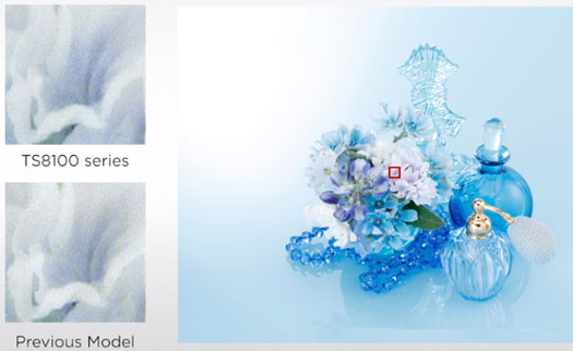 Med det nya bläcksystemet med 6 färger blir fotografierna klarare och mer naturtrogna. Pigmentbaserat svart bläck ger skarp, klar text för dokumentutskrifter och det nya bläcket Photo Blue minskar kornigheten som kan uppstå i klara färger från blått till vitt