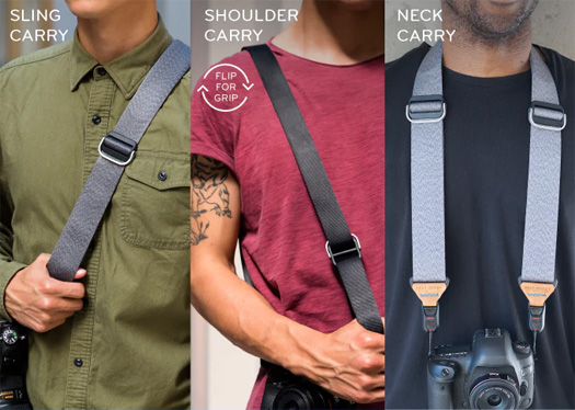 Slide kan smidigt användas antingen som nackrem, axelrem eller "sling"-rem, dvs snett över bröst/skuldror