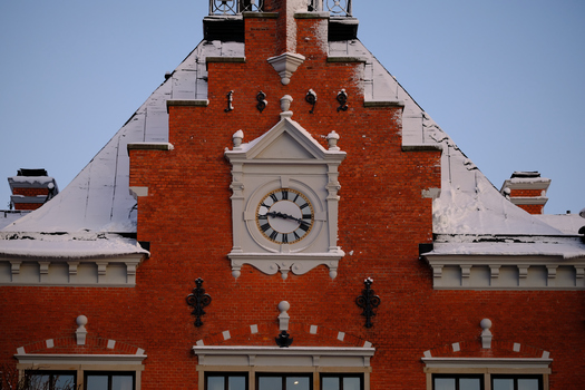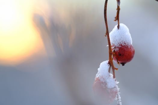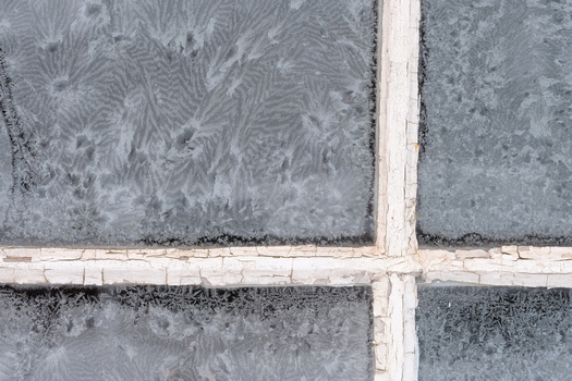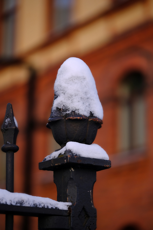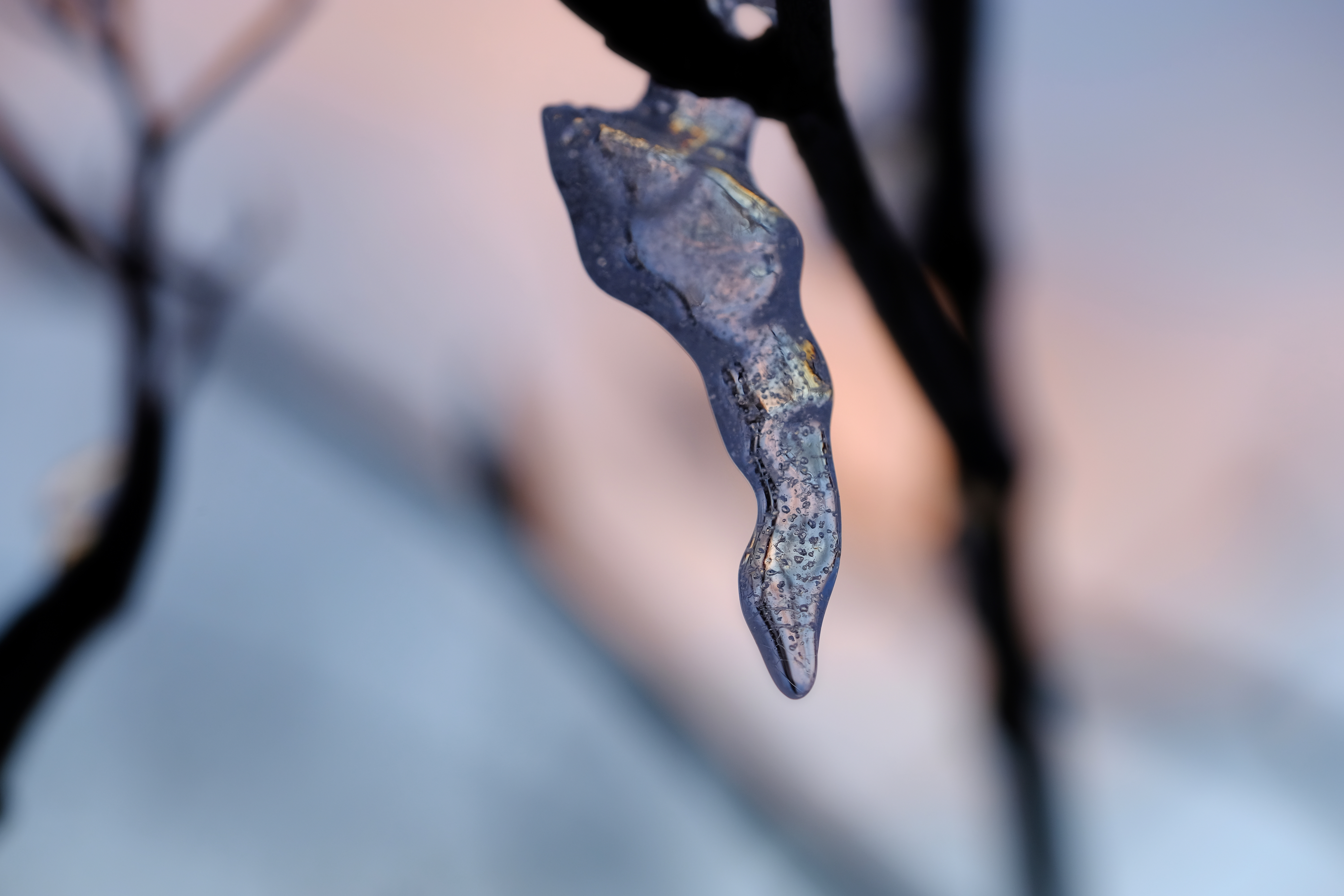 Bländare f/5,6. Närbild av en ca 2 cm liten istapp fotograferad i Umeå centrum.