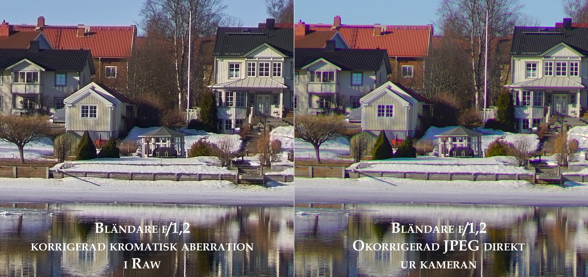 Lateral kromatisk aberration syns på samtliga bländare, dock väldigt enkel att korrigera om man tar bilderna i RAW. På f/1,2 förekommer det också longitudinell kromatisk aberration, och beroende på vilket redigeringsprogram man använder är det inte alltid lika enkelt att korrigera som lateral KA. Alla bilderna på denna sida är tagna med en Sony A7R III i RAW och korrigerade för kromatisk aberration, vilket jag personligen anser är ett måste med denna optik. Under sista bilden längst ner finns en bildlänk för att du ska se skillnaden mellan en korrigerad RAW-bild och en JPEG direkt ur kameran utan korrigering för kromatisk aberration, tagen på största bländaröppning där det blir som mest synligt.