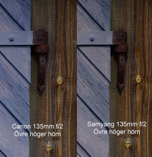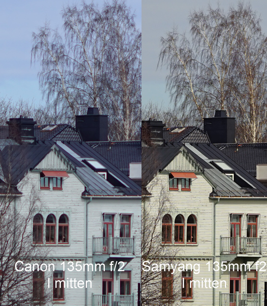 Canon 135/2 jämfört med Samyang 135/2 på största bländare i mitten av bilden. (Sony A7R + EF-adapter).